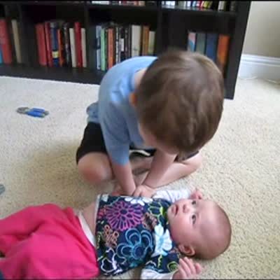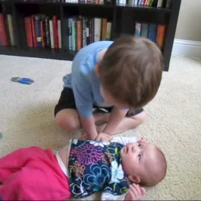 Tot boy talks to baby sister lying on the floor. Boy says the baby has a big tummy just like mom.