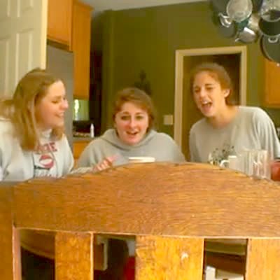 3 teen girls sing a song to the tune of "My Girl" about their dad at the dinner table. Girl falls when she walks up to camera to turn it off. Her sister laughs and milk snot comes out of her nose.