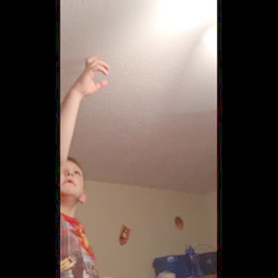 A boy makes a tune by tapping on the blades of a spinning ceiling fan with his finger at home.