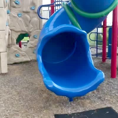 A labradoodle dog slides down a tunnel slide in a playground.