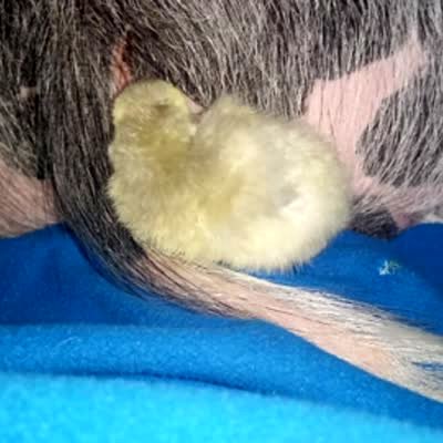 A baby turkey sleeps by a pigs butt and the pig flings it away in a house.