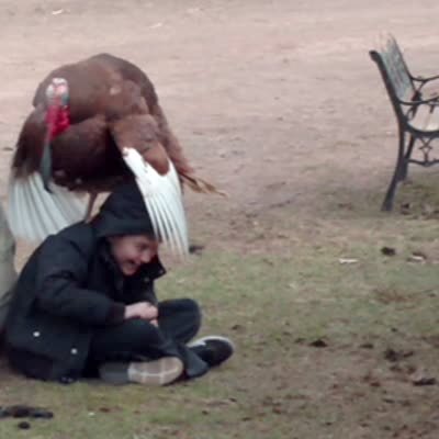 A tot boy looks up close at a turkey before the turkey flaps its wings and scares him. The boy screams as the turkey continues to follow him while his dad pulls him away. The mom admonishes the turkey and says "I will eat you!"