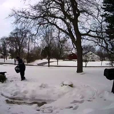 A mailman barks at a turkey and the turkey flies at the man and knocks him down into the snow. The man continues to yell at the turkey and the turkey continues to fly at him. Video repeats.