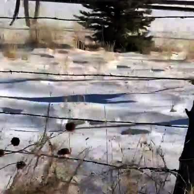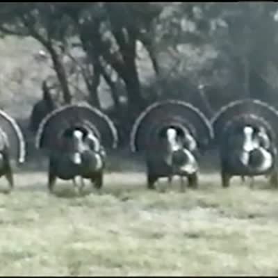 4 turkeys walk in a straight line - looks like a western gang. Funny visual.