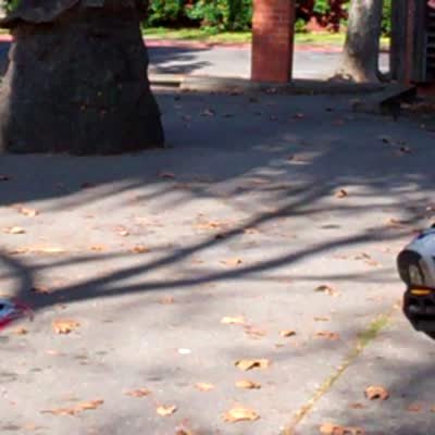Three wild turkey birds slip on an icy road as they run away from a car that follows them.