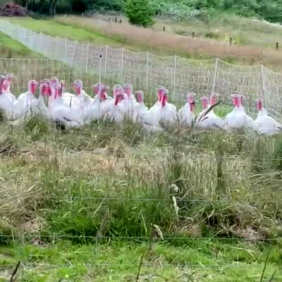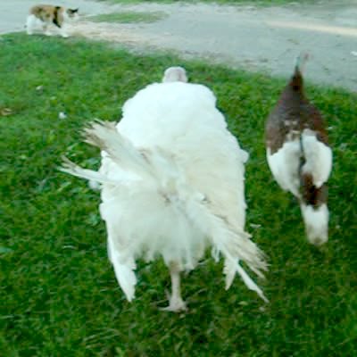 Three turkeys walk around a front yard. A woman grabs a white turkey that's feathers are all puffed up. She squeezes the turkey and the turkey lets out a loud fart/burp like noise. No tails.
