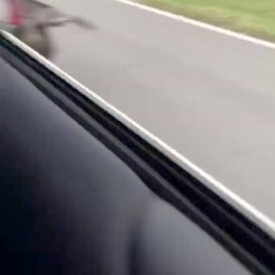 A turkey attacks a car in the road while children in the backseat scream. The driver drives away and laughs while the turkey chases the car.
