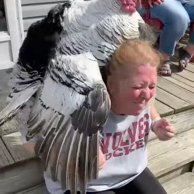 A large turkey bird climbs onto a woman's head on a porch. She yells and screams as it tugs at her hair.