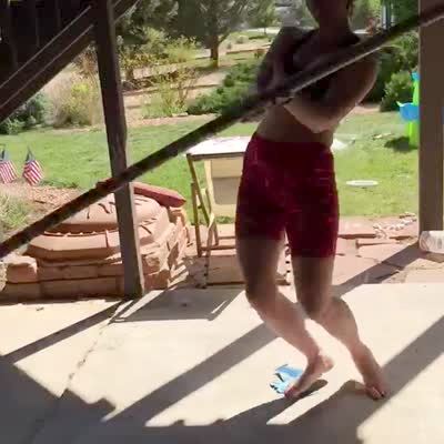 A teen girl slips off of tree stump over a creek and falls into the water after the guy behind the camera says she will fall.