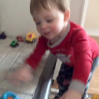 A tot girl carefully counts the cars she lined up along a fireplace at home before her twin brother slaps all the cars away one by one.