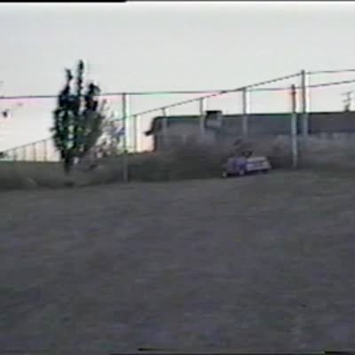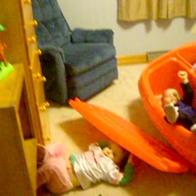 Twin girls in toy cars roll down hill. They crash, sending one girl up pole of swing set.