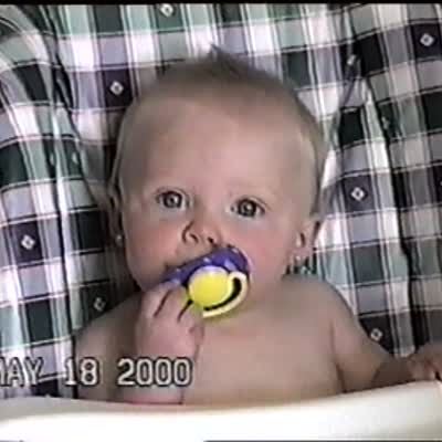 Baby girl in high chair dances and shakes her head back and forth to the music. Camera cuts to twin brother who's scowling at his sister, then cuts back to girl who's smiling and dancing. Sibling rivalry.