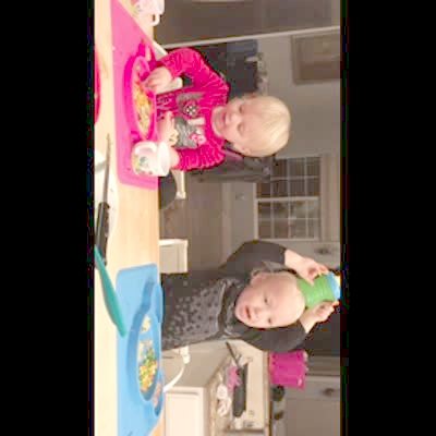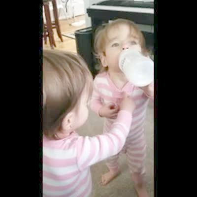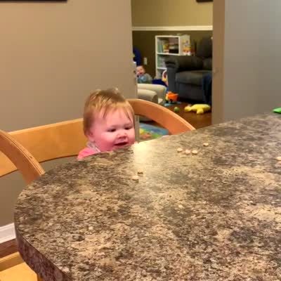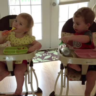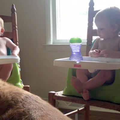 Twin tot girls sit in highchairs in the living room indoors and one of them cries because she wants the other one's food. The girl with the food holds out a piece for her sister, but when the girl reaches for it, she pulls it away and eats it herself. The girl who wanted the food gets mad and pushes her cup off the highchair.
