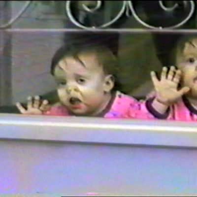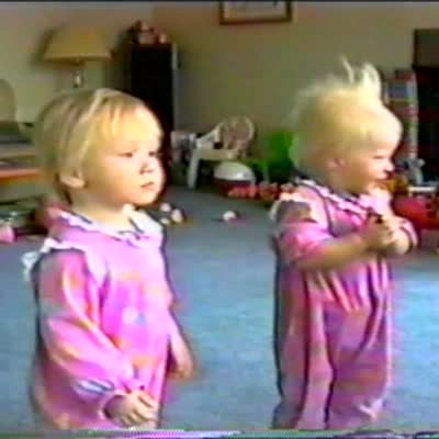 A man records a selfie in the living room and says he noticed his twin daughters turn to look at the TV whenever the theme song for "The Office" plays. The man turns the camera to show the baby girls on the floor and then they turn to look at the TV at the same time when the theme song plays. Music rights not cleared.