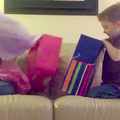 A twin young boy and girl excitedly open birthday gifts in unison on a couch indoors. They see that they both got shirts then cry at the same time.