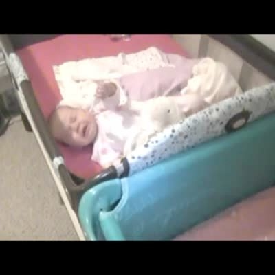 Two twin baby girls scream back and forth with each other from two separate rooms. Their mom screams along at the end, then the twins go silent.