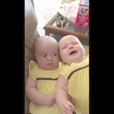 One twin baby girl cries while the other lies next to her and opens her eyes wide in horror.