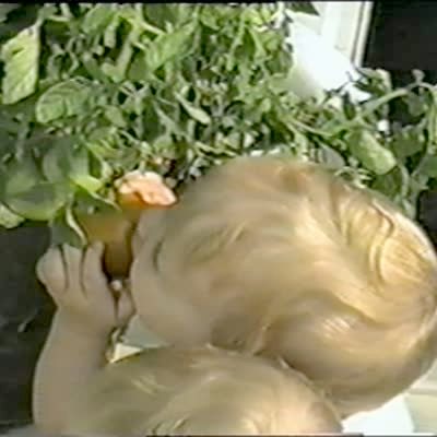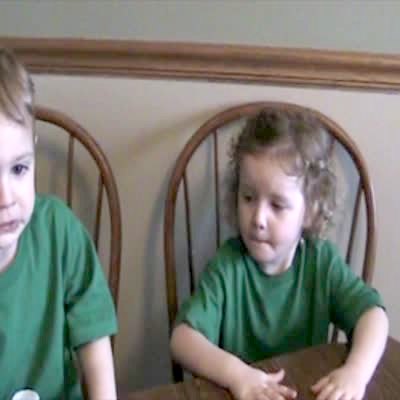 "Chew For Two" Tot boy steals his twin sister's cookie at a dining room table. She cries and the camera woman yells at the boy. The boy takes the chewed cookie out of his mouth, the girl puts it in hers, and smiles. Boy off camera when he steals the cookie. Sibling rivalry. (2210)