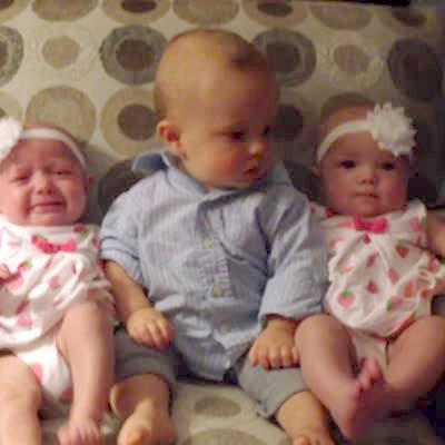 A baby boy looks confused while sitting in a chair between twin baby girls in the same outfit indoors. He looks back and forth.