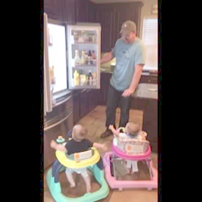 A man opens a refrigerator and a baby girl and baby boy walk up to it in their walkers.