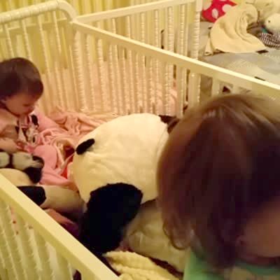 Two twin baby girls lie in cribs next to each other. They both sneeze over and over, one right after the other. Cute.