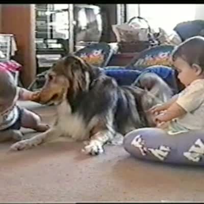 Collie dog on living room floor, licks twin baby girls on their faces. Cute.