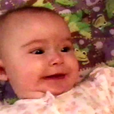 "Raspberry Babies" Two twin baby girls lie on a bed next to each other. One of the baby girls blows raspberries and the other laughs. Very cute.
