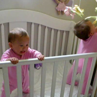 A tot girl plays with her reflection in the mirror of a closet door in the bedroom. She slides the door open and then her twin sister is inside the closet.