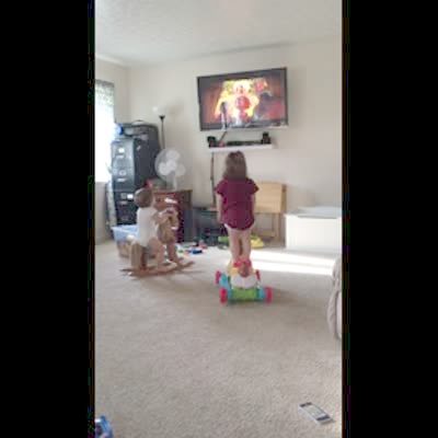 Twin tot girls stand on two separate toys in the living room and one of them falls off and hits her sister and the the sister falls on top of her too.