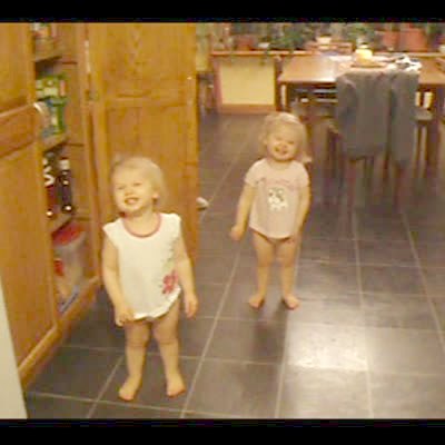 Twin tot girls say "cheese" simultaneously when they see dad filming.