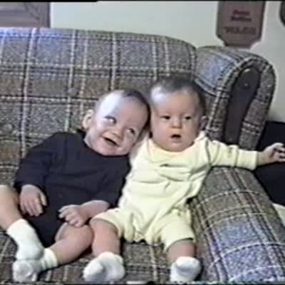 "The Happy Hiccupper" Twin babies boy and girl sit on the couch. One has the hiccups, the other laughs repeatedly.
