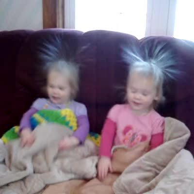 Twin tot girls rock back and forth on the couch in unison. Their hair stands up from static.