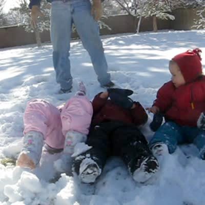 "The Three Toddler Tip Over" A girl and her twin baby brothers sit in the snow posing for a picture but the baby boys keep falling over backwards.
