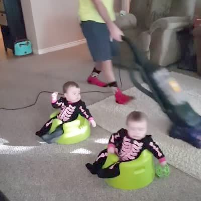 Twin baby girls watch their father vacuum and turn their heads back and forth together with his movement in the living room.