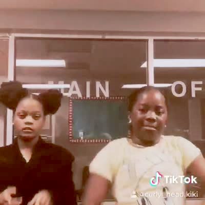 Twin teen girls do a choreographed dance in an office. One of the girls swings her arm and accidentally knocks a wig off the head of her sister.