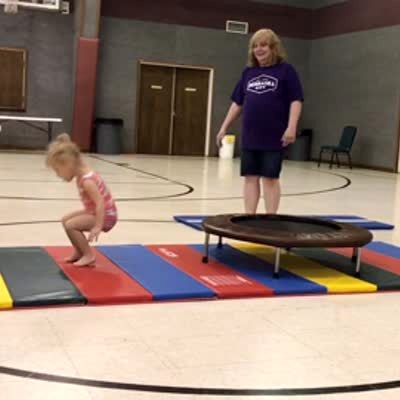 Twin girls take turns on a trampoline in a gym. One girl jumps on it, her sister walks up behind her and pushes her off and she faceplants into the floor mat.