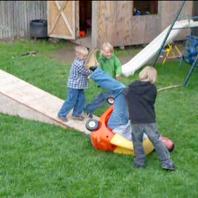 Man climbs into a small plastic toy car on a ramp. His legs and arms stick out on all sides. Goes down ramp, tumbles over at bottom. Has a hard time getting out / stuck