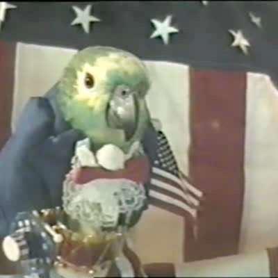 Bird dressed as Uncle Sam with a flag in his hand sits in front of a flag.