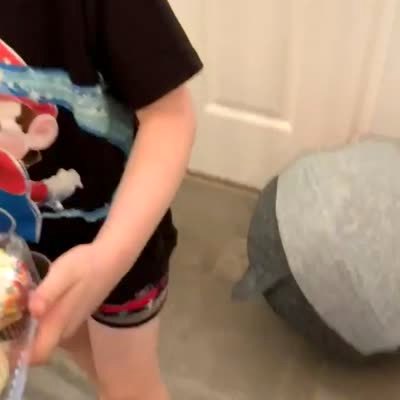 A young boy opens the door to find cupcakes on the doorstep. His mom says they are for him, and he says he does not want cupcakes. She tells him they are a surprise from someone else, and he fakes a smile and says "yay, thanks guys."