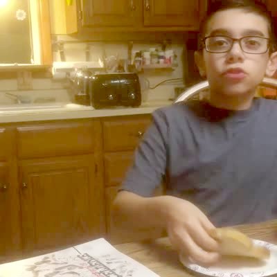 A young boy throws a piece of toast behind him and into a toaster in a kitchen.