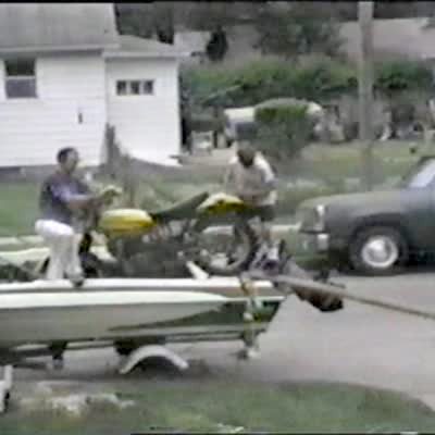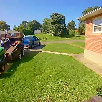 A man on a tractor tries to unload his tractor off a trailer. He flips backwards onto the front yard and says, "That's something you watch on TV." before he continues to back up the tractor. Security Footage.