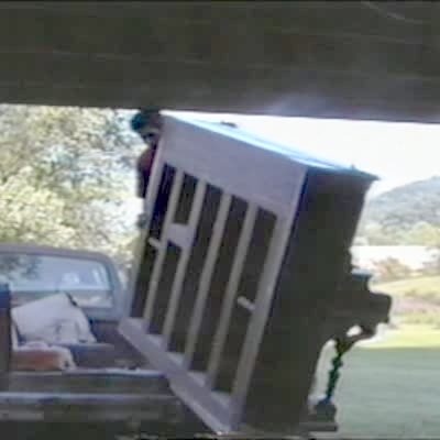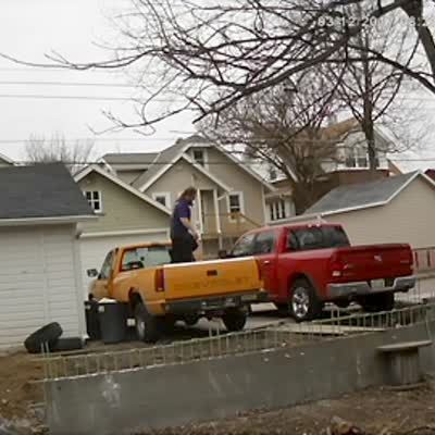 A man unloads a large pole out of a truck bed in the driveway and when he throws it out, it flips over and the other end hits him in the head.
