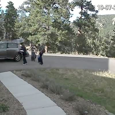 Four women unload luggage from a car and one of the suitcases rolls away. A woman chases it, then gives up as it speeds down a driveway. Home security footage.