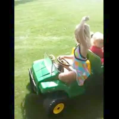 Tot and bulldog ride in the back of child's toy John Deere tractor. Tot girl drives it and dumps the other kid & dog out.