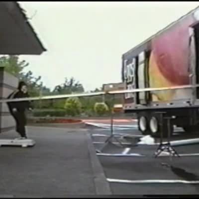 Man carrying food case runs right into the back of a truck. Shown two times. FAKE! SET UP!