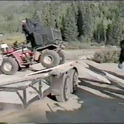 A man unloads an ATV from a trailer and leans on it and presses the throttle and it drives out of the trailer and he falls.
