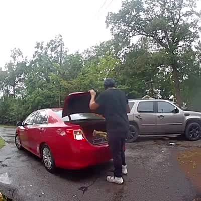 A young woman runs from the passenger side to the driver side of a parked car on a driveway while a man opens the trunk to get something, then the young woman drives away with the trunk open, and the young man runs after the car. Security footage.