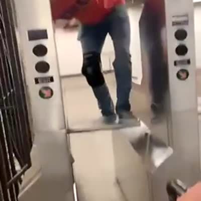 A man tries to climb over a subway turnstile, then the turnstile readjusts and he lands behind it again.