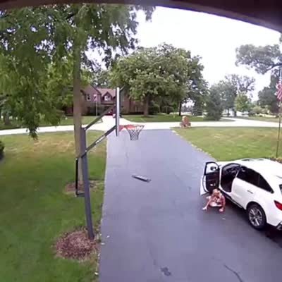 A woman drives a car out of a driveway and she clips a skateboard against a wall and the skateboard falls down and rolls down the driveway. The woman stops the car and opens the door and steps out and lands on the skateboard and slips and falls. Security camera.