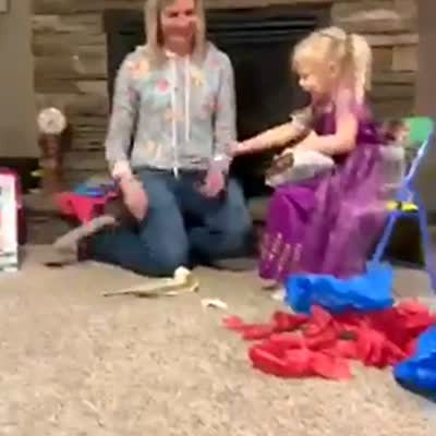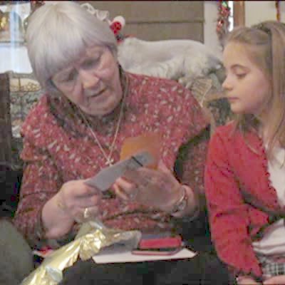 A young girl opens a small gift bag and a senior woman tells her that the gift bag is her own present. The girl says that nothing is inside and tells the senior woman "you guys must have been on the naughty list."